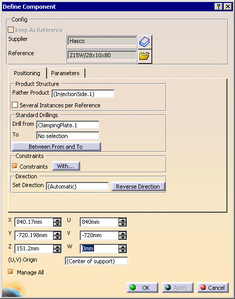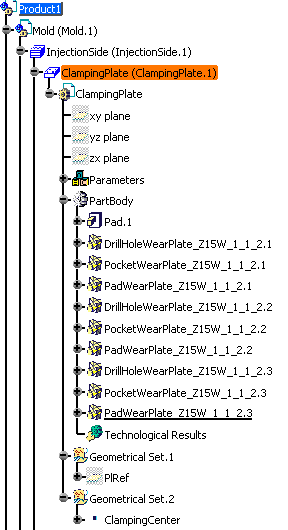 e.g. PocketForMilling. We recommend that you choose names that indicate the final purpose of the pad or pocket as there may be several in a user component. Pads and pockets are only applied to the element defined in the DrillFrom field of the Define Component dialog box. These bodies will be used in the order they were created. |