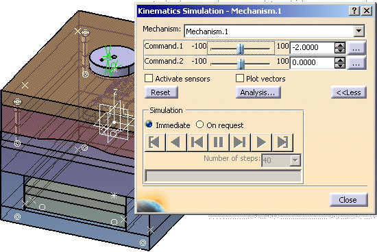mechanism. Moving Command.1 and Command.2 sliders animates the joints.