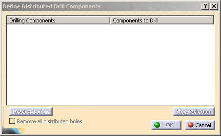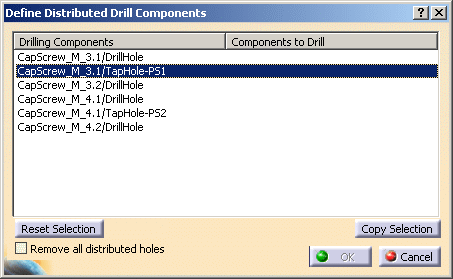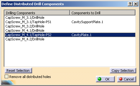 Other actionsRemove all distributed holes allows you, when drilling a plate for the second (or more) time, to remove all of the holes that have already been drilled from the list. Reset Selection deselects the line that is selected in the dialog box. Copy Selection duplicates the line that is selected but leaves the Components to drill part empty so that you can select a list of components to drill by the same drilling component. |