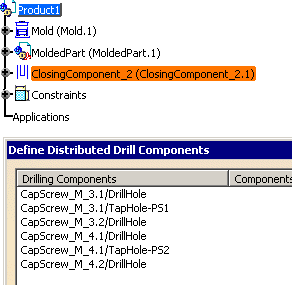 Preselection codesPre-selection codes can be added to the end of drilling body names to define, in one shot, the components they are to drill. They are used with the Distributed Drill Component ... command. These codes are assigned as suffixes to the names of the Add/Remove bodies. The codes are -PS* and _PS* where * is one digit. You can only define 10 pre-selection codes from -PS0 to -PS9 and/or from _PS0 to _PS9. |