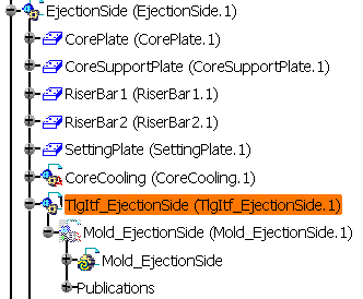 Work on blocks in a structureIn order to facilitate concurrent engineering, this application has been enriched with an automatic part interface to allow you to work on a single block (injection side, ejection side, ejector system, for example) even if components have been added to another block with results (drill holes, for example) that impact the block you are working on. The part interface appears in the specifications tree when a block is impacted by the insertion of a component in another block and requires no user interaction whatsoever (it contains data on the context of contextual links) . Its name starts with Tlgitf but its end varies according to the block that is impacted. For instance, in the image below the part interface is called Tlgitf_EjectionSide because the ejection side is impacted by the insertion of a component in another block.