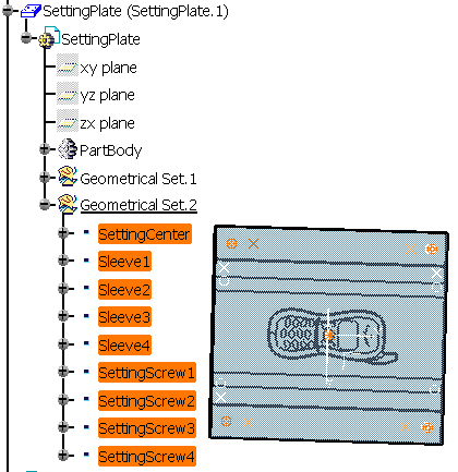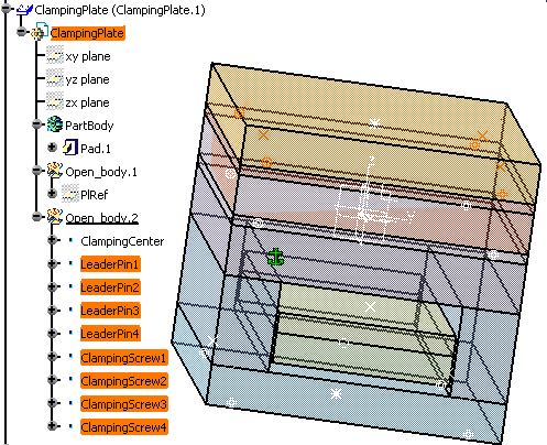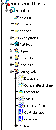 MoldedPart must contain the part to mold and all surfaces required for the core plate and cavity plate split. The Geometrical set containing the parting surface must be called PartingBody. When splitting a component, all bodies included in the component will be split. If there is a body that you do not want to split, rename it with two underscores as a prefix (i.e. body1 becomes __body1). If a surface named CavitySurface is found in the specification tree, it will be automatically proposed as the splitting element for the cavity plate. If a surface named CoreSurface is found in the specification tree, it will be automatically proposed as the splitting element for the core plate.