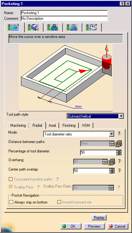 accessible: the machining operation can be modified. Otherwise, the OK button is inactive: the machining operation cannot be modified. The Tool Path Replay functionality is accessible: