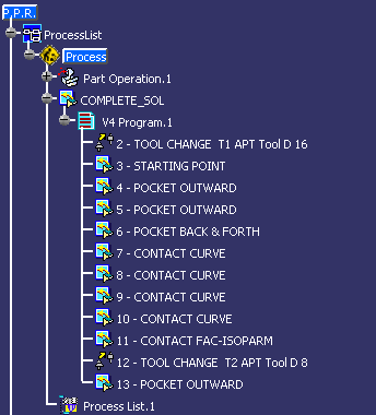 manufacturing information of the selected NC Mill set. A program V4 Program.1 containing all the machining operations and tool changes of the NC Mill set is added at Manufacturing Program level.