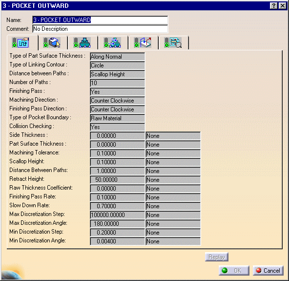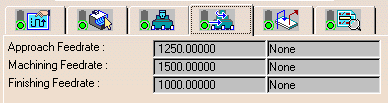 The set of feedrates of the NC Mill machining operation are displayed along with their values and any associated parameters names. This is set to None if the feedrate is not parameterized. Note that all possible feedrates are listed for each operation. Note that no spindle speeds are displayed as these were not managed for NC mill operations. |