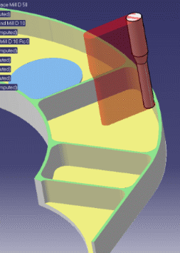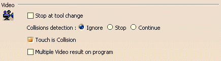 To access the Video Collision options, go to Tools > Options > Machining > Photo/Video tab. In the Video area, select Collisions detection: Continue (the default value is Ignore) and verify that the Touch is Collision check box is selected (to report soft collisions). When you select Collisions detection: Stop, the simulation stops during collision, and you are able to continue video simulation from the stopped point.