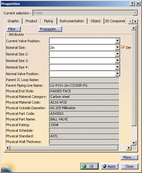 • Specific to Diagrams products are the following tabs: Piping, Equipment, Instrumentation, Tube, Waveguides and HVAC. They will display depending on the class of object whose properties you are editing. Click the More button if one of these tabs does not display, or if you want to see other tabs. More than one tab may display for some objects, such as Piping and Equipment, if the object has properties in more than one domain.