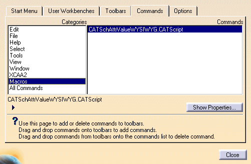 | 2. | Select the Commands tab and select Macros in the Categories column. All macros are displayed in the Commands column. | |