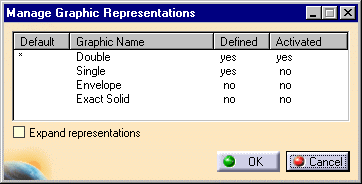 | 7. | If the value for a graphic in the Activated column is Yes it means you can see that graphic. (You can toggle between Yes and No by clicking on it.) If you check the box Expand representations you can see more than one representation of that part in the same document - if the representation exists. | |