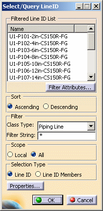 | 2. | Use the Sort and Filter options if you need to. Under Scope, select the Local option if you only want to filter line IDs in the document. Select All if you want to filter all line IDs available to you. The Filter String field allows you to enter a line ID name - you can use wild cards. Clicking the Filter Attributes button brings up the Line Attribute Filter dialog box. See Select/Filter Line IDs to learn more about filtering. | |