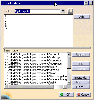 | 6. | To recall the search order, click Import in the Other Folders dialog box and select the file that specifies the catalogs you want to open. Click OK. This will create a new search order and these catalogs will display when you click the Browser button. | |