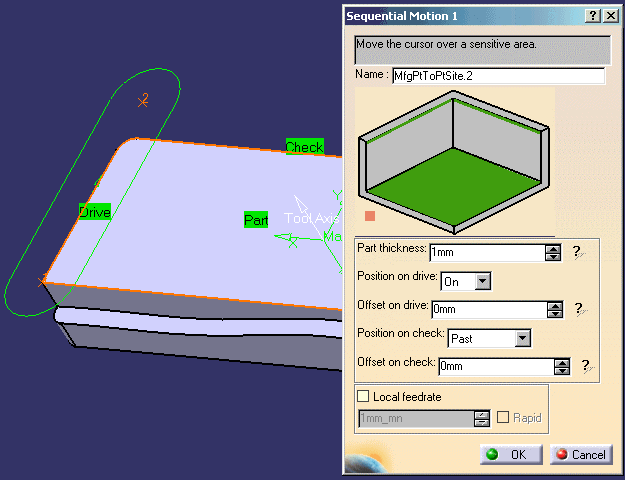 | 4. | Just click OK when you have specified the desired elements and conditions. The second tool motion is defined and appears in the list in the Point to Point dialog box. | |