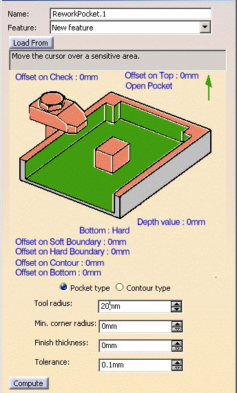 The Prismatic Rework Area dialog box appears. Click Load From then select the Pocketing operation that you have just created. The Rework feature is initialized with the geometry and other characteristics of the defined operation. You can rename this feature (for example, ReworkPocket.1).