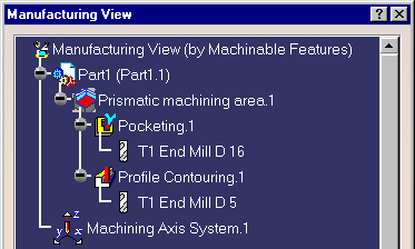 Use the Sort by Machining Features contextual command to see how the Prismatic machining area is referenced by the Pocketing and Profile Contouring operations.