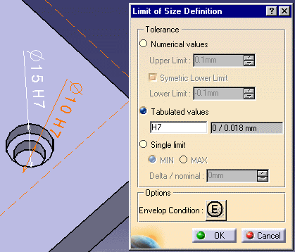 tolerance of one of the toleranced holes (for example, Diameter 10 H7). The Limit of Size Definition dialog box appears. For the selected Diameter 10 H7 tolerance, the tabulated values are set to H7 and 0 / 0.018mm as minimum / maximum values. Click OK to quit the dialog box. These values can be accessed in Knowledgeware expressions using the following functions: