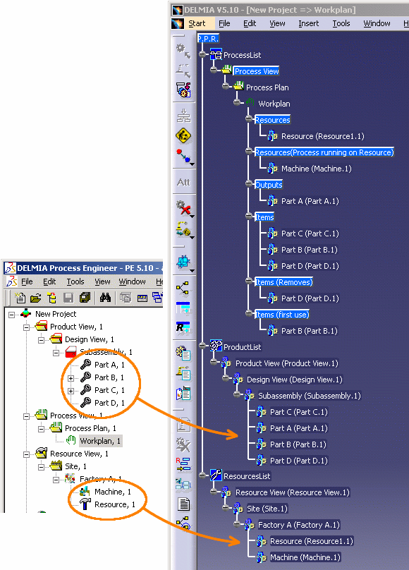 The following sections detail the relationships between Process Engineer entities and their DPM counterparts. |