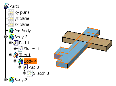 components. This task shows you how to replace a trimmed body with a basic body. As this basic body is not trimmed, during the operation you will have to redefine the Union Trim operation. |