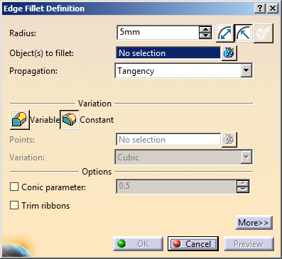 This task shows you how to use one of the fillet commands designed to fillet edges. | |||||