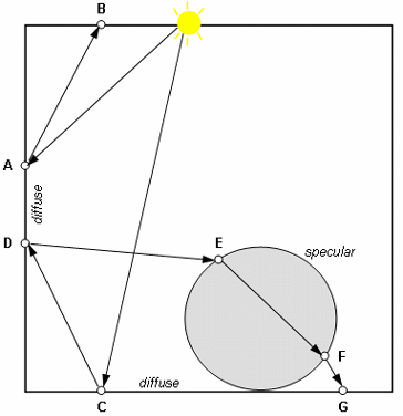 hits a diffuse wall and is reflected at point A but not stored (it