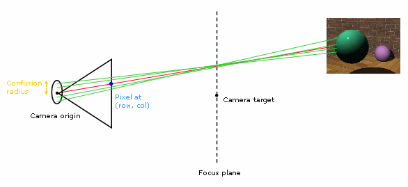 the green lines correspond to rays sent for a depth of field