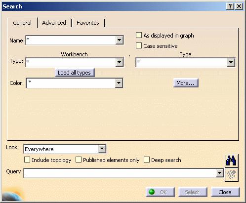 | You can also run advanced queries and save your favorite queries using the Advanced and Favorites tabs. For more information, refer to Using the Search... command (Advanced and Favorites Mode) . | |||||||||