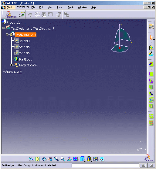 This task shows you how to enter the Ship Structure Detail Design workbench. Structure Detail Design actually consists of two workbenches - Structure Detail System Design and Structure Detail Object Design. You must first create a design unit, and make the CATPart under it active, before you can correctly enter the Object Design workbench. This is shown below. | |