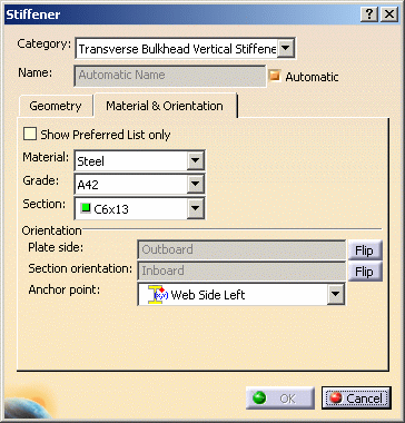 NOTE: The anchor points that display in the Anchor Point field are defined in the file ShipStructureMoldedConventions.xml. See Defining Molded Conventions for more information. |
