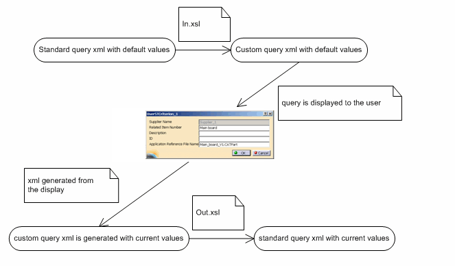 Queries are used to map objects loaded in CATIA to objects existing in the SmarTeam database. The SmarTeam reconciliator provides one query, Latest available revision, which can be launched without an interface or interactively. Custom queries can be defined based on any of the standard (base DS) queries. Custom queries can define the parameters that make up the query and/or supply default values for the query parameters. Only parameters defined in the Integration Rules Setup are available for custom queries. The following steps summarize how the custom query works:
