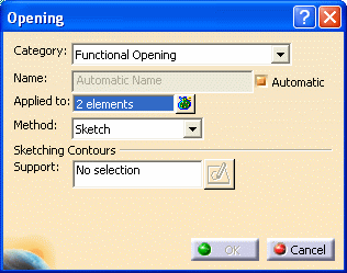 If the object on which the opening is to be placed is planar then it will be pre-selected. If it is curved then you will have to select a planar surface or plane. Click on the Sketcher button to open the Sketcher and make an elongated opening using one of the tools. To learn about the Sketcher you need to see Sketcher documentation.