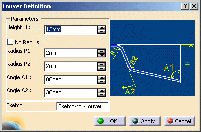 Check the No radius option to deactivate the Radius R1 and R2 values, and to create the louver stamp without a fillet. |