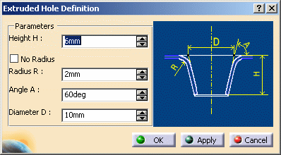 This task shows you how to create an extruded hole by specifying the punch geometrical parameters. |