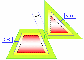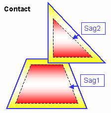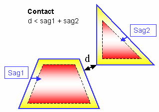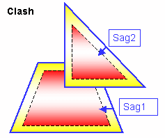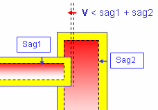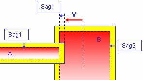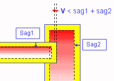 V is the penetration vector and visualizes the penetration depth. In the second illustration above, if you translate product A by V, both products are in contact. Important: If V < sag1 + sag2, a clash may be detected (see below). |