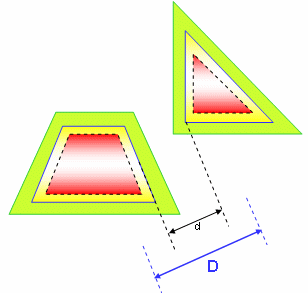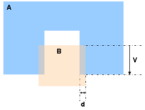 A clash is detected between products A and B. V is the penetration vector and visualizes the penetration depth. Note that V is greater than the authorized penetration in our illustration. If the authorized penetration is greater than distance d, no clash is detected. |