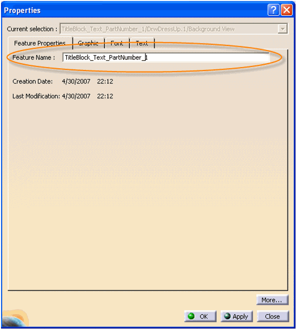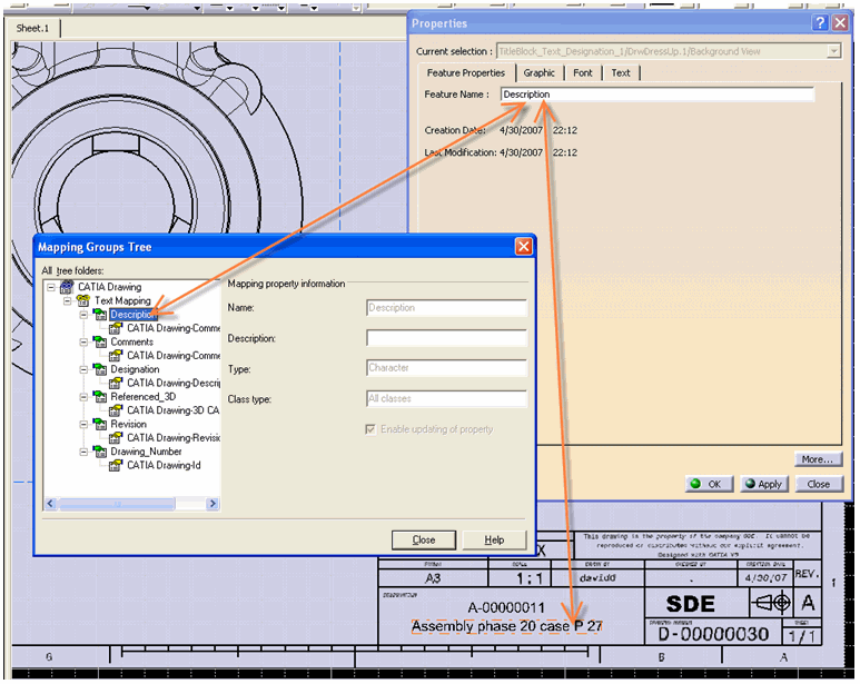 Defining the Feature NameIn the Title Block Properties window, the administrator types in a specific Feature Name in the Feature Name field. Defining Mapping in SmarTeam Integration Tool SetupThe feature name is mapped to SmarTeam using the Integration Tool Setup. In the Integration Tool Setup, the administrator defines mappings between the CATIA Drawing text and a SmarTeam attribute, as shown in the example below: