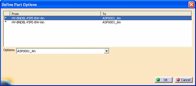 Define Parts Options dialog box displays. You can see the heavy parts that you selected display under the From column. Select a heavy part from the From column, and the Options list becomes available.