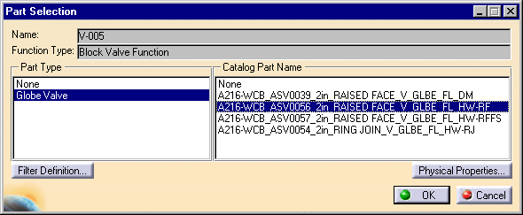 part has been placed in-line the available part types and part names are filtered with respect to the attributes of the line ID on