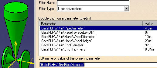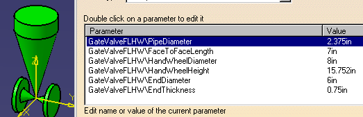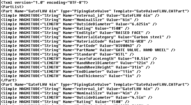 For Unix run the command: CATAecPartGeneration.sh XXX.xml The two images below show the template CATPart "Gate Valve FLHW" and a 4-inch gate valve FLHW after it was generated using the sample part definition file. You can see that the attribute values and geometry have changed.