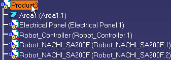 This task shows you how to create a parent-child relationship between two elements. This function can be used to create a relationship between resources, between a resource and an element like an area; or between products in a process. The example below uses electrical parts and robots. The procedure is the same for all types of objects and elements. | |