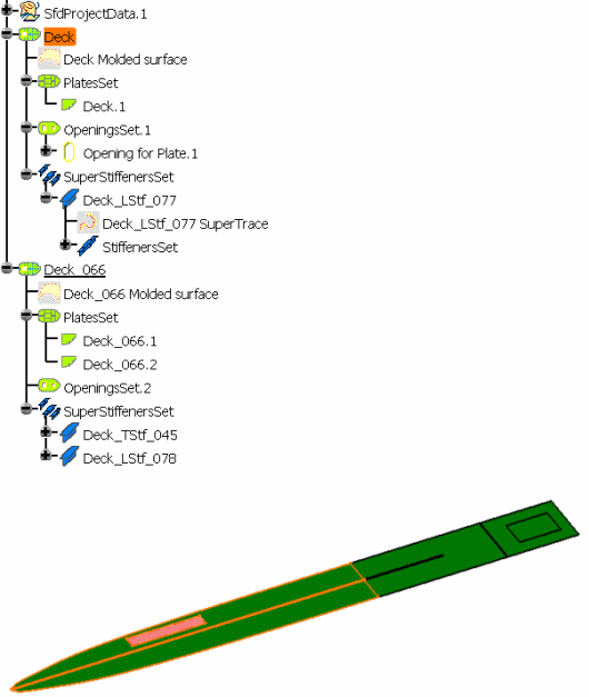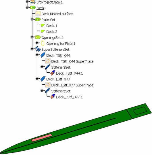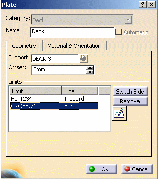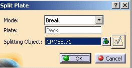 ![]() Unlike Creating a Seam on a Plate, new plates are created and the split plate is modified. The splitting object is set as a new limit of the resulting plates. When you edit the Deck panel, you can see that CROSS.71 has been set as a limit of Deck. Create a new plate containing stiffeners, opening and seams.