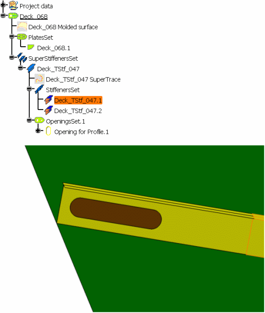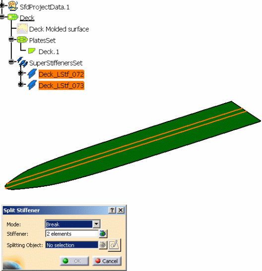 stiffeners. When you edit the stiffener panel, you can see that CROSS.71 has been set as a limit of the stiffener. In one stiffener, the splitting object is seen as the Start Limit and in the other stiffener as the End Limit. Unlike Creating a Seam on a Stiffener, the openings and the seams aggregated under the stiffener to split are cleaned during the break processing. They are removed if they are useless. |