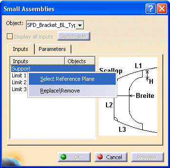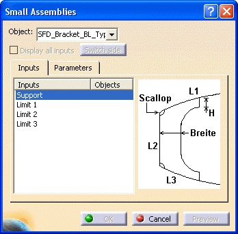 The Small Assemblies dialog box displays. The support and other inputs for the bracket type display under the Inputs column. Also, an image of the bracket type displays.