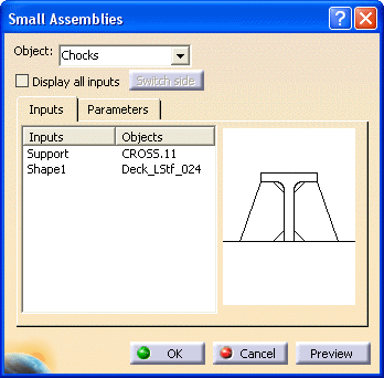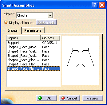 Selecting a shape and support for placing a chock results in an error, if the faces of the selected shape do not match the faces required as input. In such a case, Display all inputs helps you manually select the faces corresponding the input faces. Select the Display All Inputs checkbox. All the faces required as inputs for placing the chock are displayed. Select the corresponding faces of the shape in your 3 D session. Your selection appears as Objects.