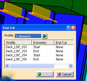 Select the beam and the stiffener on free edge in the 3D session. Both these profiles are highlighted and their details are displayed in the End Cut dialog box.