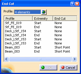 End Cuts. The name of the selected end cut appears in the End Cut dialog box. In the example given below, Web-Snipe-Radius-R1 end cut is placed on all the selected profiles.