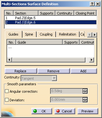 Select the horizontal edges on the pads as sections for the multi-sections surface.