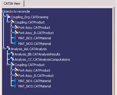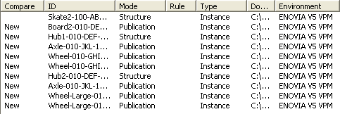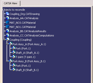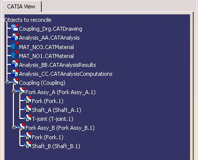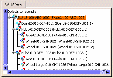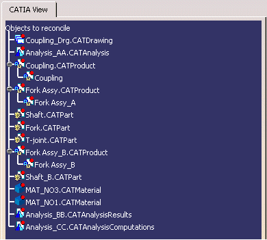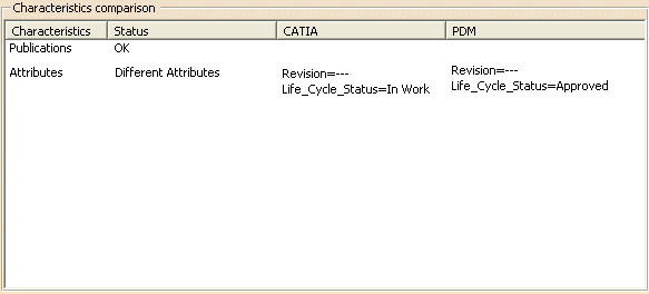 | This tab enables you to access the comparisons result after comparing the document loaded in the CATIA session and the document stored in ENOVIA. |