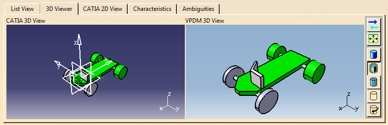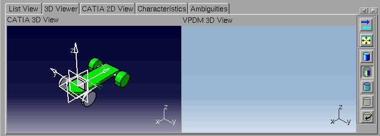 Management. For ENOVIA V5 reconciliation, the 3D visualization is available in VPDM 3D View area even without activating the cache; as soon as .cgr files are available in ENOVIA V5 server. These .cgr files are generated from the ENOVIA V5 server by enabling the file introspection process on the corresponding V5 server. If CATIA cache and file introspection are not activated on the server, 3D visualization is generated on the fly and is available in VPDM 3D View area. In the CATIA 3D View area, 3D visualization is available for CATProducts, CATParts, CATAnalysis documents and CATIA V4 models. The 3D Viewer Toolbar enables you to define and manage the different viewpoints and visualization modes. | |
